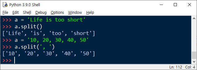 'Life is too short'라는 문자열을 공백을 기준으로 나누기 위해 split() 함수를 사용했습니다. 그리고 '10, 20, 30, 40, 50'이라는 문자열을 ', '을 기준으로 나누기 위해 split(', ')를 사용했습니다.